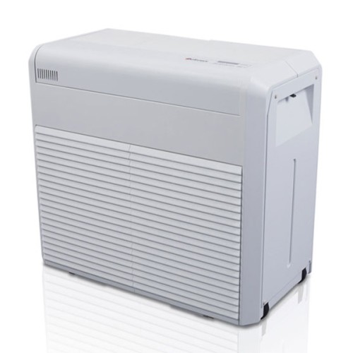 This mobile humidifier with a capacity of up to 2.7 l/h is suitable for rooms up to 900 m³. It is equipped with a large 30 liter water tank, allowing longer operating intervals between refills. The water tank has cast casters and can be easily detached and rolled to the sink for filling.