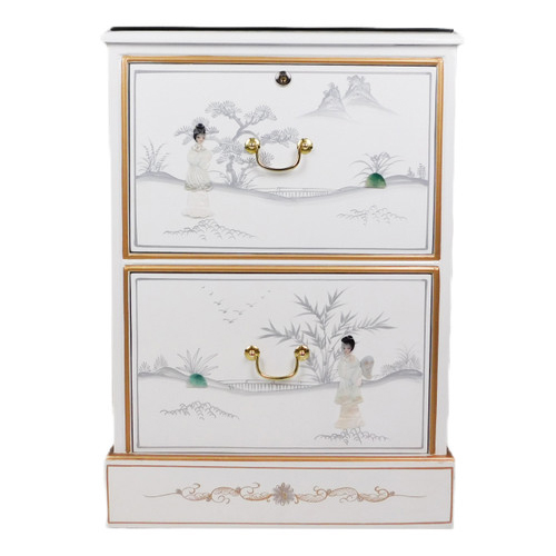 Update your office with this rare, handcrafted Asian designed file cabinet. This cabinet is inlaid with mother of pearl inlaid on the top, sides, and front. It measures 30 inches high, has two locking drawers with a glass top, and is perfect for your home office. It is so beautiful you can even use it as an end table or nightstand in your living room or bedroom. Rest assured, classified or personal belongings are safely kept in the locking storage drawer. This piece is hand-finished in lustrous white lacquer with silver hand painting and an inlaid mother of pearl and made of wood with brass hardware and a locking top drawer. This piece is perfect for use at your work office or home office. Purchase now; inventory is lean on superb handcrafted imports.